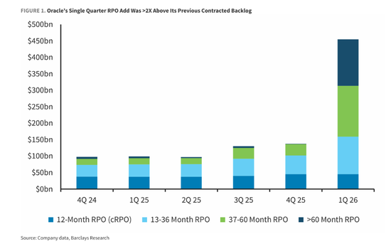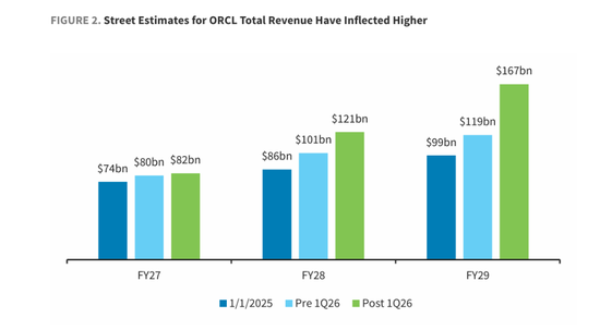 在第一财季获得创纪录的3170亿美元RPO增量(是其此前RPO存量的两倍多)后,甲骨文已经成功地将一个关于长期增长的宏大叙事摆在了投资者面前。这一惊人的增长促使市场分析师大幅上调预期,其中对甲骨文2029财年的营收预测从990亿美元飙升至1670亿美元。