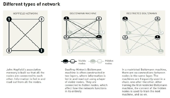 1985年,杰弗里·辛顿、计算神经生物学家特伦斯·谢诺夫斯基(Terrence Sejnowski) 等人扩展了霍普菲尔德的思想,创建了一类新的模型,称为玻尔兹曼机,以19世纪物理学家路德维希·玻尔兹曼(Ludwig Boltzmann ) 的名字命名。顾名思义,这些模型的设计植根于玻尔兹曼开创的统计物理学。
