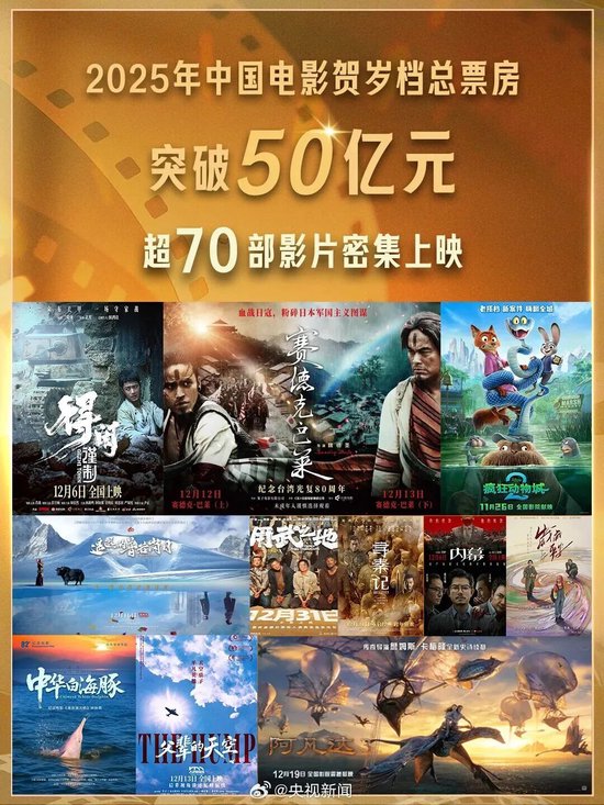 截至12月28日,2025年贺岁档档期(11月28日—12月31日)总票房破50亿元,创近八年来同期票房新高。