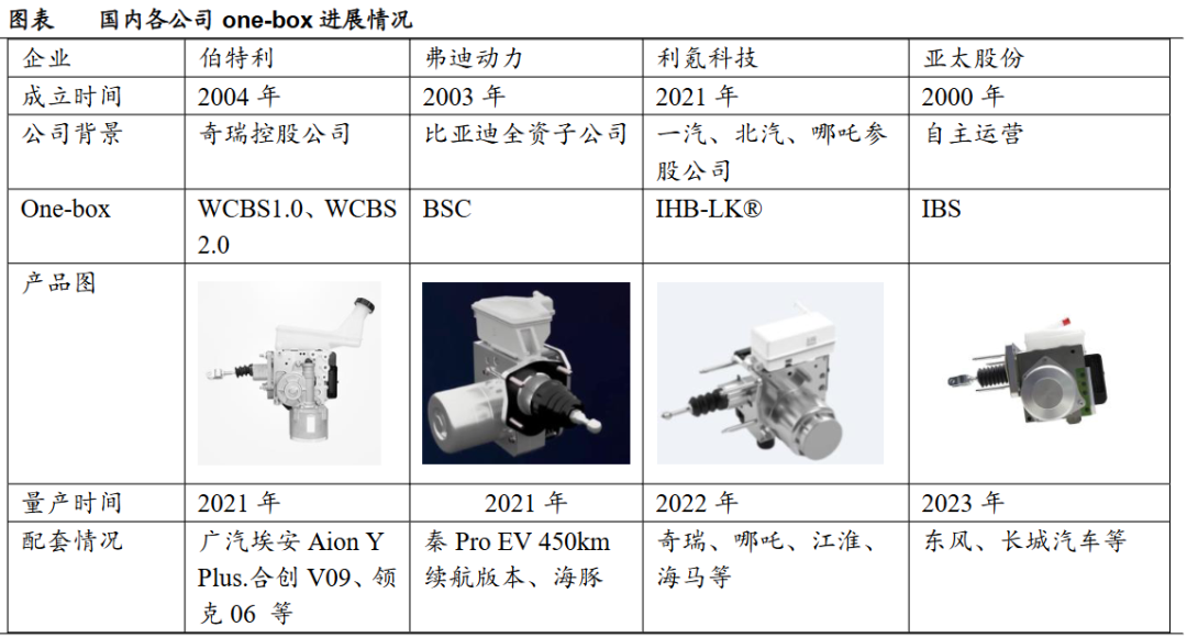 国内厂商也在加速对One-Box产品的布局,目前已经能够实现量产One-Box产品的厂商有伯特利、弗迪动力、利氪科技和亚太股份。