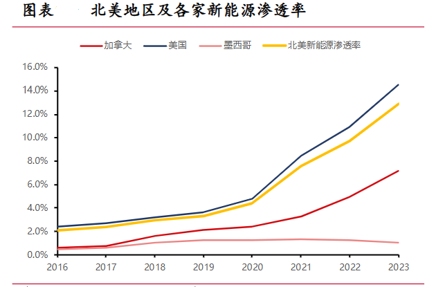 2023年北美地区(美国、加拿大、墨西哥)的新能源车销量达到了248.4万辆,同比增长49.8%,其中美国的新能源渗透率增长较快,达到了14.5%。