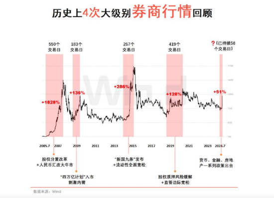 复盘历史可知,券商板块在历次大牛市中通常表现突出,2005-2007、2008-2009、2014-2015、2019-2021的四轮牛市,券商股涨势均十分显著,是行情的主要助推器,并对市场产生重要影响。