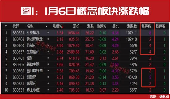 1月6日,医药板块多点开花,肝炎、新冠药、仿制药、生物疫苗等相关医药概念逆势走强,一度霸榜通达信概念板块涨幅榜前十(见图1)。其中,肝炎概念的118只成份股有107上涨,8只触及涨停,包括鲁抗医药、众生药业、哈药股份等;新冠药、仿制药、生物疫苗概念分别有2只、4只、4只触及涨停。
