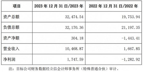 标的公司新聚力于2023年才实现业绩扭亏以及资产净额转正。2022年和2023年,新聚力实现营收分别为0.17亿元、1.05亿元,实现净利润分别为-0.13亿元、0.17亿元,资产净额分别为-0.14亿元、3.22亿元。