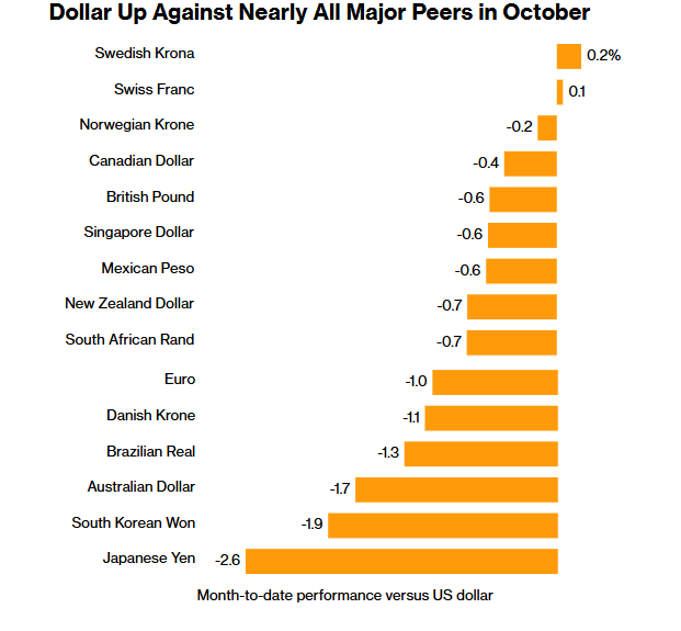 行情数据显示,本月迄今美元兑绝大多数主要货币均出现了上涨,部分得益于区域性银行信贷问题引发的避险买盘。自10月1日美国政府停摆以来,美国官方经济数据持续缺位,传统避险资产美元在此背景下持续攀升。