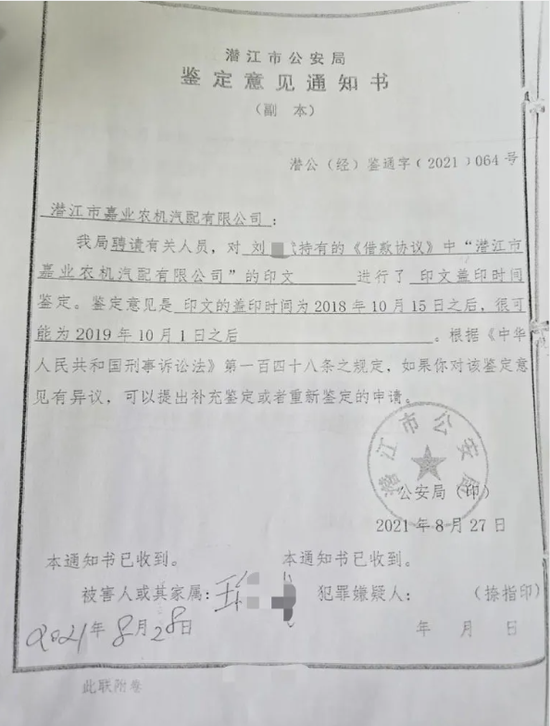 4389号判决在“本院认定事实”部分讲述了之后的过程:2021年潜江公安以刘国斌涉嫌虚假诉讼立案侦查,并聘请湖北一家司法鉴定中心对《借款协议》形成时间进行鉴定,后者出具《司法鉴定意见书》认为,协议“盖印时间为2018年10月15日之后;很可能为2019年10月1日之后”。