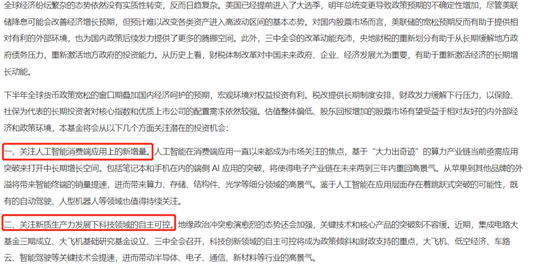 对于机会的展望,他关注人工智能消费端的应用,新质生产力、贵金属和红利资产。