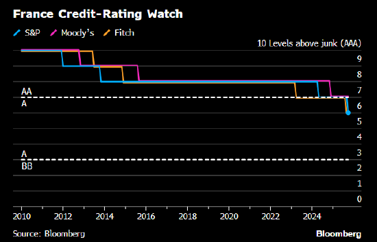 此次评级下调为本周画上句号。本周,法国总理塞巴斯蒂安·勒科尔尼暂停推进埃马纽埃尔·马克龙总统的核心养老金改革,以维持执政地位,从而使政府在不信任投票中得以存续。