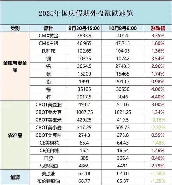 2025年国庆中秋假期期间,外盘有色金属品种表现优异,具体来看,伦铜上涨3.54%,伦锡上涨4.06%,伦镍上涨1.74%,伦铝上涨2.96%,伦锌上涨0.98%。