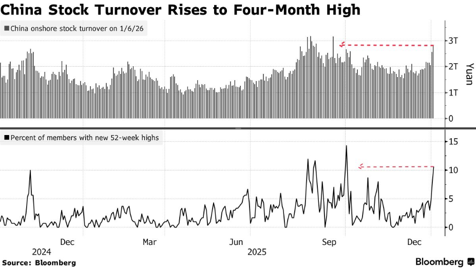 中国股市的上涨势头已强劲延续至新的一年。尽管中国股市2025年已经录得大幅上涨,但高盛仍与其他多家大型机构一道,维持对该市场的积极展望。这一乐观判断,反映出市场对“盈利扩张、政策扶持、新增增长动能将持续吸引投资者入场”的信心。