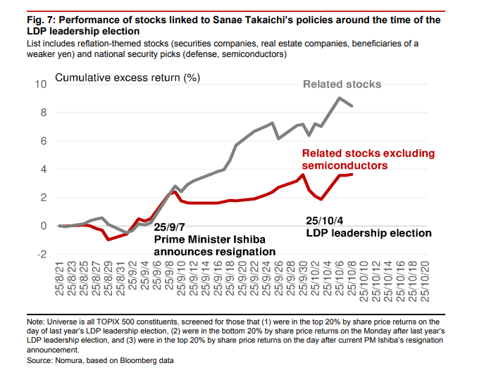 野村的报告强调,未来走势的分水岭在于政治层面。如果新任领导人高市早苗能够组建稳定政府并维持高支持率,相关股票可能在海外投资者的推动下维持上涨势头;反之,若政局不稳,则这些股票很可能重现历史上的反转模式,尤其是高波动性股票。