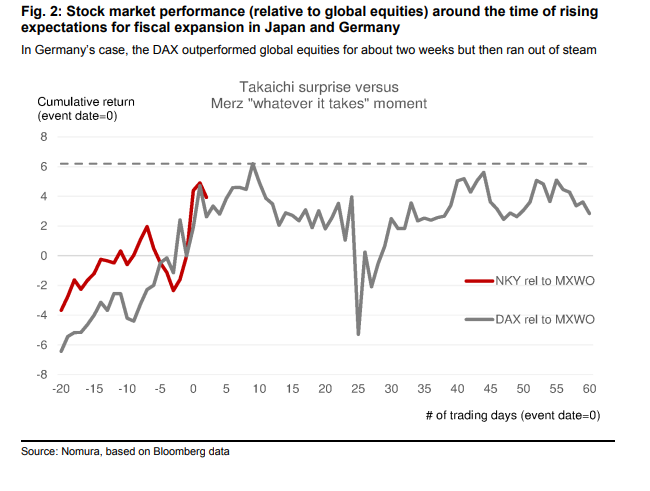“高市行情”的初步动力正面临消退的风险。野村分析师Yoshitaka Suda指出,当前由财政扩张预期驱动的日本股市上涨,与今年3月德国股市的状况有相似之处。当时,德国因调整财政政策,其股指在约两周内跑赢其他发达市场,但随后上涨势头便宣告枯竭。
