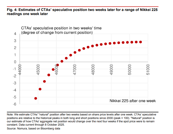 从资金流向看,投机性投资者已从积极买入转向观望。野村的模型估算,CTA在日股的净多头敞口上周已超过2万亿日元,这极大地限制了他们现阶段进一步净买入的潜力。报告预计,除非日经225指数跌至46400点附近,否则CTA不会逆转并退出其多头头寸。