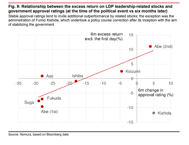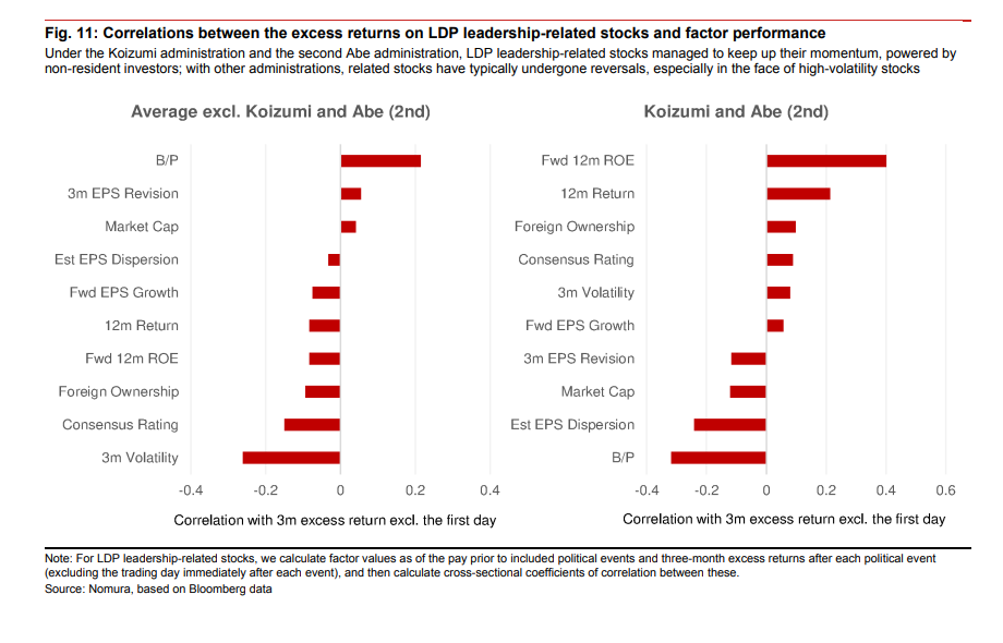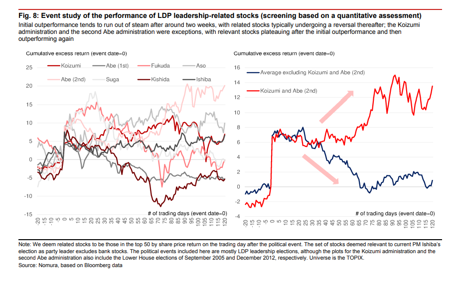首先,在众议院选举或自民党总裁选举后的一到两周内,与新领导人政策相关的主题股通常会跑赢大盘。其次,这些股票在随后的三个月内往往会经历反转下跌。