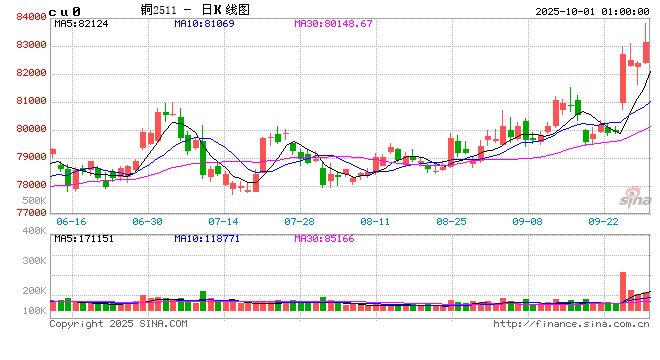 3、观点。三季度铜价走势乏善可陈,基本已低波动率运行为主,影响因素一是TACO交易盛行下市场情绪明紧暗松,市场风险偏好有所回升,二是美联储开启降息周期前的美经济就业数据回落,经济衰退预期又使得市场难有较高的看涨情绪。从基本面的角度,国内一度进入淡季,金九的表现也未能超预期,但数据表现较好;海外则担心美铜库存“堰塞湖”下的回流冲击市场。进入四季度,市场的宏观驱动呈现出海外与国内分化态势。海外方面,特朗普关税政策不确定性已大幅降低,美联储9月美联储开启预防性降息周期,为金属价格提供了支撑环境;国内四季度稳增长压力减轻,暂时难有更加期待性的政策出台,宏观驱动偏弱。四季度铜市场供需格局的关键变化在于,印尼Grasberg铜矿事故成为转折点,或牵动市场对铜供应链脆弱的敏感神经,供应趋紧认知加剧,此前精铜预期过剩的局面或将被打破。基于此,我们认为四季度宏观驱动减弱下,铜供需潜在的变化相比其他品种而言利多更加确定,铜作为多头配置比重或加大,并支撑铜价重心逐步上移,预计铜价或逐步推升至上方8.5万~8.7万元/吨平台,支撑位7.9万~8万元/吨。投资者四季度关注风险点:一是Comex与LME价差是否逆转,可能导致美国库存高企可能回流非美市场,冲击全球铜价;二是美联储主席鲍威尔警示美股估值较高下,是否存在潜在的金融系统性风险;三是高铜价对下游持续抑制导致四季度需求大幅不及预期。