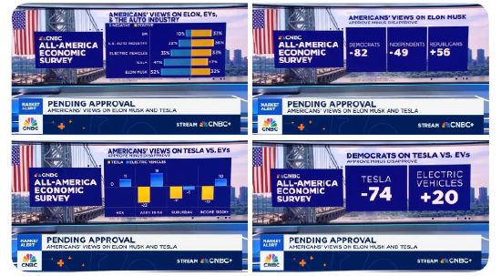 4月份的一项民意调查显示,马斯克在美国成年人的净赞赏率(正面评价和负面评价之间的差值)已经跌到负20%,而在民主党选民中的净赞赏率更是降到负82%,即便在中间选民中,这一数据也是负49%。对马斯克的负面看法也直接体现在了特斯拉的销量中。