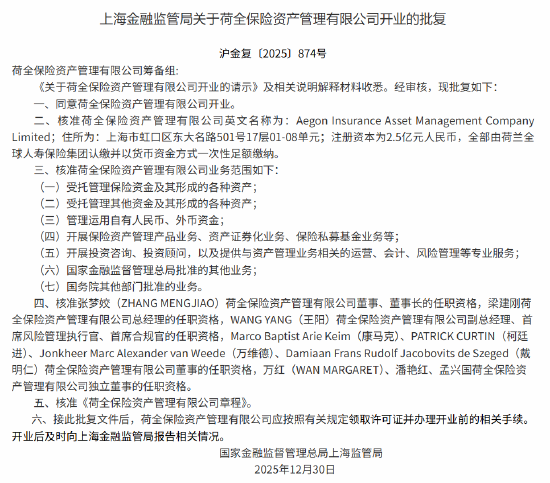 12月31日金融一线消息,上海金融监管局发布批复,同意荷全保险资产管理有限公司开业,核准荷全保险资产管理有限公司英文名称为:Aegon Insurance Asset Management Company Limited;住所为:上海市虹口区东大名路501号17层01-08单元;注册资本为2.5亿元人民币,全部由荷兰全球人寿保险集团认缴并以货币资金方式一次性足额缴纳。