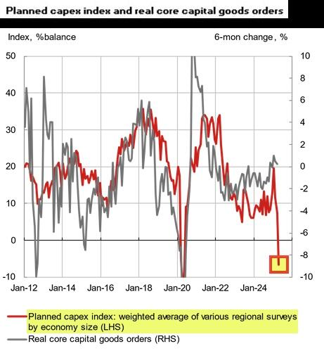 野村经济学家团队追踪的"美联储综合预期资本开支指数"(Composite Regional Fed Planned Capex Index)最近跌破-4。该指数汇总了各区域联储调查数据,按经济贡献度加权平均计算。