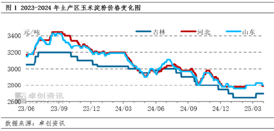 据卓创资讯数据显示,截止到3月31日,2025年一季度山东地区玉米淀粉企业加工利润理论值25.01元/吨,环比2024年四季度盈利下降96.04元/吨,行业盈利状况不断恶化,进入3月份之后行业普遍陷入亏损的局面。原料玉米价格居高不下与玉米淀粉下游需求疲弱是造成行业加工利润下降的重要原因。一方面由于市场粮源出现阶段性供给不足,玉米收购价格连续上涨,成本压力不断加重。另一方面玉米淀粉市场由于受下游需求疲软低迷的拖累,玉米淀粉价格向下游传导不畅。上下游共同施压的背景下,导致玉米淀粉行业加工利润出现下降。供给充足且价格低廉的原料玉米红利消失殆尽。