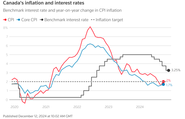 加拿大央行:加拿大央行周三降息50个基点至3.25%,这是其自新冠疫情爆发以来首次连续降息50个基点。加拿大央行表示,在通胀率加速上升至2%之后,进一步的宽松政策将是渐进的,但由于加拿大疲弱的经济受到了美国当选总统特朗普提出的关税威胁,市场对加拿大央行下个月降息25个基点的概率押注仍高达70%。