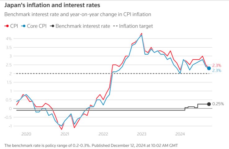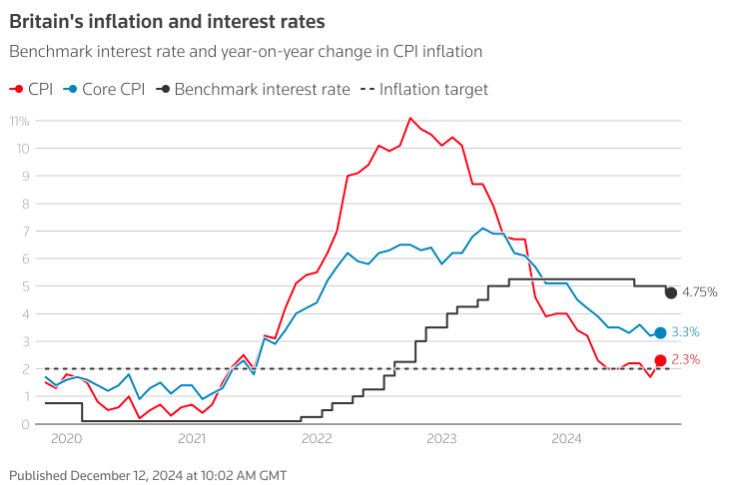 英国央行:英国央行在11月降息了25个基点,这是自2020年以来的第二次降息。货币市场暗示,英国央行在12月19日的下次会议上保持利率稳定的可能性为90%。交易员们目前预期,英国基准利率将从眼下的4.75%稳步降至2025年底的约3.9%,因为在新工党领导下,政府支出的增加将促进经济增长,并使通胀率保持在英国央行2%的目标之上。