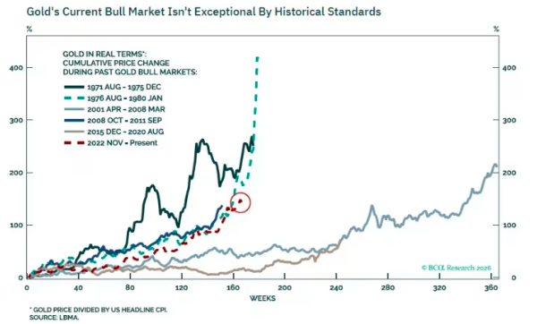 Ibrahim表示,当前的黄金牛市“从历史标准来看并不算异常”。就涨幅而言,本轮黄金牛市还落后于1971年-1974年以及1976年-1980年的牛市。