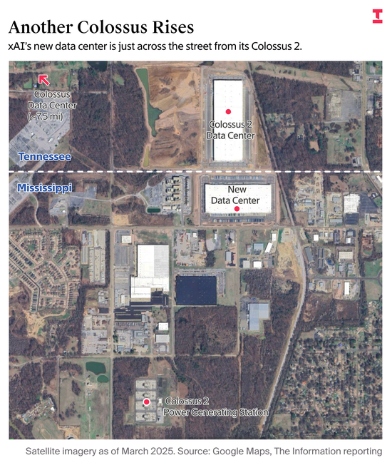 2025 年初,xAI 已从巨像 1 号数据中心拆除部分燃气轮机。同期,该公司与得克萨斯州能源企业索拉里斯能源基建公司成立合资企业,在密西西比州启动燃气轮机发电,并开建一座永久性燃气轮机发电厂。该电厂正为巨像 2 号供电(马斯克称其最终将配备 55 万枚英伟达图形处理器),且距离最新购置的第三座数据中心足够近,未来亦可为之供电。2025 年,xAI 已建成连接各设施地块的全新输电线路。