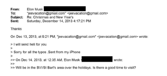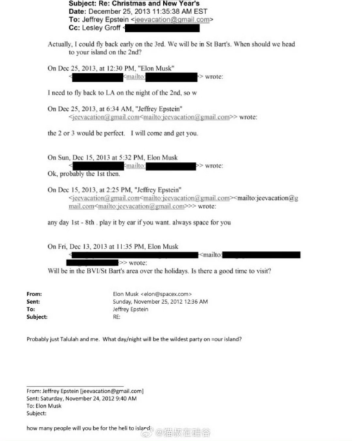 于是,2013年12月,马斯克再次联系爱泼斯坦,称自己圣诞节期间会在英属维尔京群岛和圣巴茨岛,询问何时可以上爱泼斯坦的岛访问。爱泼斯坦回复,“只要你想,永远给你留着位置。”后来他又表示,“我会派直升机去接你(马斯克)”。而且,2014年12月,爱泼斯坦的日程表显示,他亲自安排了马斯克上岛访问。