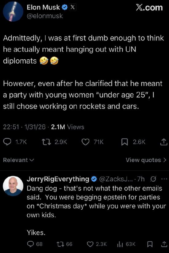 此外,马斯克还试图解释那个“最狂野的派对”:“老实说,一开始我确实蠢到以为他真的指的是和联合国外交官们一起聊天 不过,即便在他澄清是和“25岁以下”的年轻女性一起开趴之后,我还是选择了继续搞火箭和汽车。”