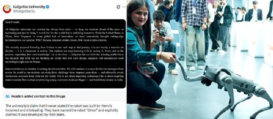 报道指出,社交平台X在这份声明下附加注释,指出校方的说法“并不符合事实且具有误导性”,“他们将机器狗命名为‘Orion’,并明确声称这是由他们的团队研发的”。