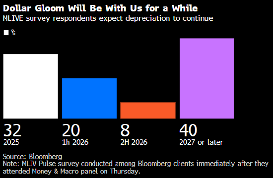 对美元的预期则更加悲观,25位受访者中有68%预测美元将持续贬值,至少持续到明年上半年。其中包括40%的受访者认为贬值趋势将延续至2027年。