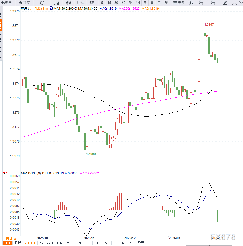 结构上,1.3600为短期关键支撑位,下破该区域可能打开进一步回落空间至1.3530附近;若汇价出现反弹并站上1.3660-1.3680阻力区,则有望回到震荡盘整格局。整体来看,GBP/USD日线偏向短期回落整理,但仍受美元强势和BoE利率消息影响,短线震荡加剧。