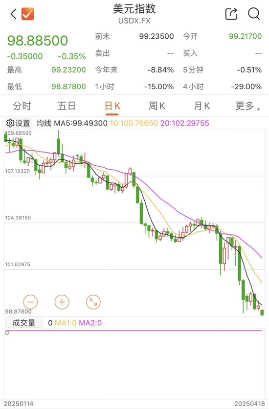 4月21日,美国资本市场再度承压。美元指数本周开盘后大幅下挫,跌破99关口,为2022年4月以来首次。美股三大股指期货小幅低开,其中标普500指数期货、纳指期货一度跌超0.5%。