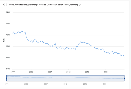 美元在全球央行外汇储备中的占比正在逐渐下降,当前已降至三十年来最低水平。