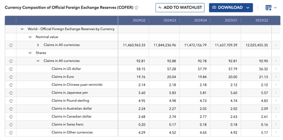 “这意味着,即便各国央行未对其投资组合做出任何调整,以美元计价的非美元资产价值也有所上升,从而导致美元资产所占份额相应减少。”IMF认为,今年4月至6月,美元在全球央行储备中份额约92%的降幅由汇率因素引起。