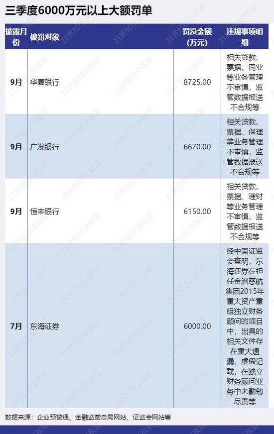 三季度金融机构被罚没超10亿 四家机构收超6000万大额罚单