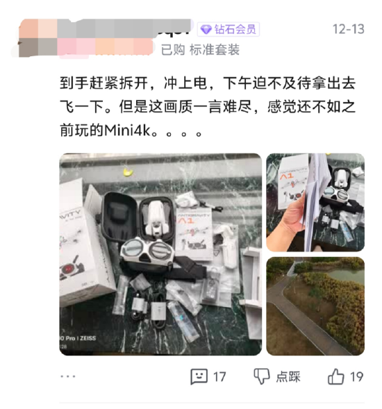 另外,作为影石推出的第一款无人机产品,一些用户在购买后也反馈存在画质、图传等方面的问题。一位京东用户表示,“到手赶紧拆开充上电,下午迫不及待拿出去飞一下,但是这画质一言难尽,感觉还不如之前玩的MINI4K。”还有天猫用户表示,“图传垃圾,稍微有点遮挡物图传就断,虽然会自动返航,结果没几次就自动返航过程中坠机了。”