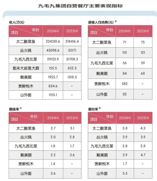 据九毛九财报显示,2024年二季度,自营太二餐厅人均消费69元、怂火锅人均消费104元、九毛九人均消费55元。2023年,太二人均消费75元、怂火锅人均消费113元、九毛九人均消费58元。