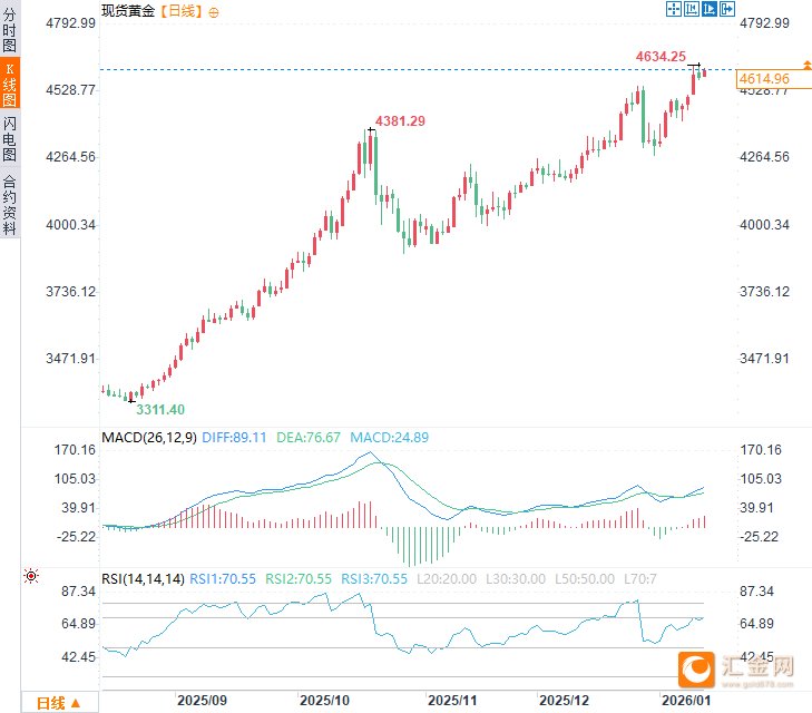 格陵兰事件并非普通外交摩擦,其背后是大国战略博弈与联盟信任危机,已成功向市场注入“地缘政治风险溢价”。黄金作为终极避风港,价格将直接受益于该事件的任何升级,并为投资者对冲国际秩序不确定性提供了经典工具。周三亚市时段,现货黄金震荡上行,日内涨幅约0.65%,现交投于4615美元附近,接近历史高点,隔夜金价一度刷新历史高点至每盎司4634.25美元,。