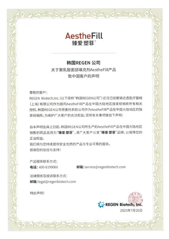 直到7月18日晚,一封通过邮件送达的《解约函》点燃了两家公司的商战。爱美客控股的韩国Regen公司单方面宣布:撤销达透医疗作为艾塑菲产品在中国大陆独家经销商的所有授权,即刻禁止其以经销商身份开展经营活动,并不再接收任何新订单。