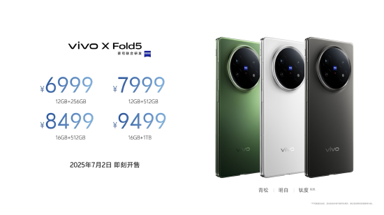 vivo X Fold5发布即开启预售,7月2日将正式全网发售,售价6999元起,16GB+1TB顶配版9499元。