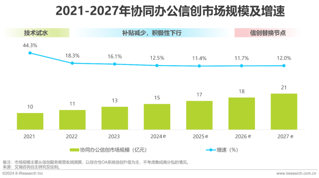 信创,即信息技术应用创新产业,是数据安全、网络安全的基础,也是新基建的重要组成部分。在信创体系中,办公软件属于应用软件层。办公软件的信创化主要要求办公产品能兼容适配企业的信创环境。其中协同办公场景侧重于组织内部的流程管理和信息共享,产品功能复杂,标准化程度低。企业招投标时,通常更重视厂商的技术方案与服务支持。2023年协同办公市场规模约13亿元,增速约16.1%,预计在国资委79号文影响下,2026年增速会有小幅上升。