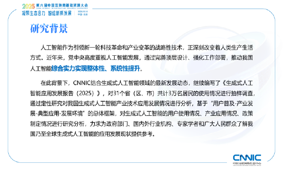 10月18日,中国互联网络信息中心(CNNIC)在2025(第六届)中国互联网基础资源大会上发布《生成式人工智能应用发展报告(2025)》(以下简称《报告》)。中国互联网络信息中心副主任张晓对《报告》进行了发布与解读。