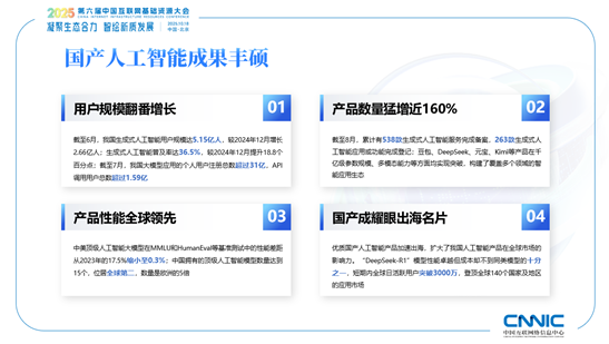 《报告》展现了当前我国生成式人工智能相关产业的发展全景。一是用户规模显著增长。截至2025年6月,我国生成式人工智能用户规模达5.15亿人,较2024年12月增长2.66亿人;生成式人工智能普及率达36.5%,较2024年12月提升18.8个百分点。二是逻辑推理能力显著提升。随着技术日趋成熟,用户对生成式人工智能的要求不断提高,在各类实际应用场景中更加看重人工智能对复杂任务的处理效果,推动生成式人工智能的逻辑推理能力显著提升,模型参数规模不断扩大、模型架构设计持续优化、数据质量有所提升。三是多模态能力跨越式发展。随着生成式人工智能技术的快速进步,其在处理多模态数据时的理解、生成和跨模态协调能力也得到显著增强。国产生成模型不仅在语义响应、动态质量、画面美学等方面的生成效果显著提升,还能理解用户提供的图片、视频等多模态参考信息,从而强化模型对作者创意的理解能力。四是模型推理成本显著降低。模型推理成本的显著降低成为推动生成式人工智能技术商业化的重要因素。以相关模型为例,其产品系统推理成本在2022年11月至2024年10月期间下降超过280倍。五是轻量模型成为趋势之一。生成式人工智能企业在不断提升主力模型性能的同时,也积极推出轻量模型,满足用户在不同应用场景下的需求。无论是国内厂商还是海外厂商,都积极发布轻量模型,为用户提供低成本、易部署的解决方案。