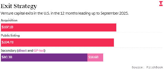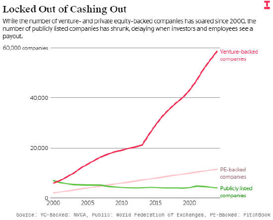 按此资金回笼速度,投资者需等待12 年以上才能收回本金。且这一测算还建立在流动性均匀分布的假设之上,实际情况远非如此:私募公司股份的二级市场交易中,96% 的交易集中在仅 20 家企业,IPO 募资也仅来自 23 笔交易。其余数万家获风投支持的私募企业,投入的资金基本处于冻结状态。
