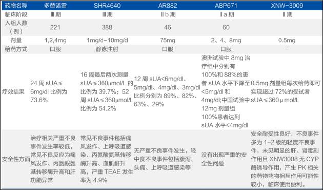 除此之外,其他竞争对手的研发进展也颇为迅速,一品红与Arthrosi合作研发的URAT1抑制剂AR882全球Ⅲ期临床试验完成全部受试者入组;璎黎药业的YL-90148则在中国与美国同步开展Ⅲ期临床研究;信诺维开发的XNW3009片处于Ⅲ期临床阶段。