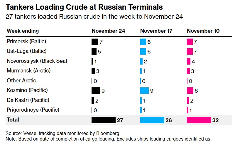 油轮在俄罗斯码头装载原油——截至11月24日的一周内,有27艘油轮装载了俄罗斯原油