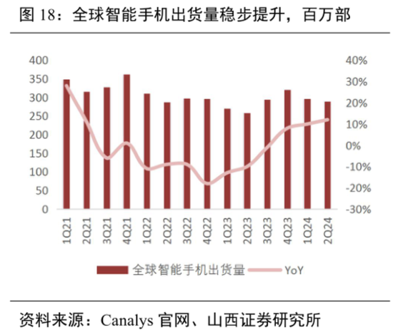 2024年第一季度,全球智能手机市场出货同比增长10%达到2.96亿台;第二季度全球出货量同比增长12%达2.89亿台,连续3个季度实现正向增长,且增幅持续走阔。