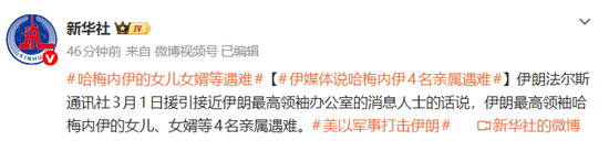 稍早前,伊朗法尔斯通讯社3月1日援引接近伊朗最高领袖办公室的消息人士的话说,伊朗最高领袖哈梅内伊的女儿、女婿等4名亲属遇难。(此前报道:美以称“哈梅内伊已死”,特朗普最新发声!伊朗宣布关闭霍尔木兹海峡!联合国安理会召开紧急会议)