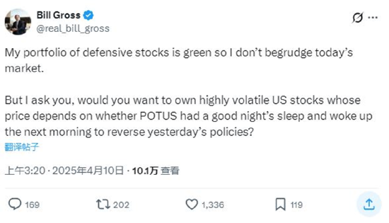 新“债王”比尔-格罗斯就对美股的波动及其对特朗普决策的高度依赖表示担忧。他在X上发帖称:“我问你,你真愿意持有这样波动性巨大的美股吗?而且美股的走势竟然取决于美国总统是否睡足好觉、第二天早上醒来后是否又推翻了昨天的政策?”